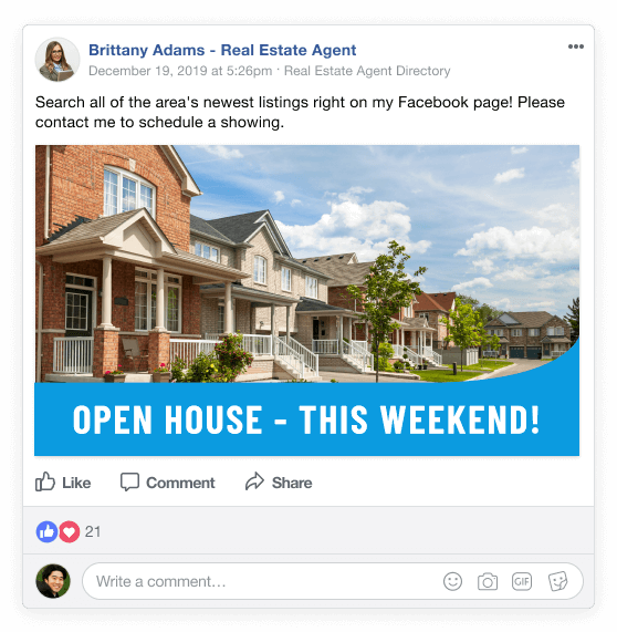 Unlike with a personal page, Facebook business pages allow you to launch inexpensive advertising campaigns that have the potential to reach thousands. Facebook ads are totally customizable and can promote your business page, IDX Home Search, listings, open houses and more!